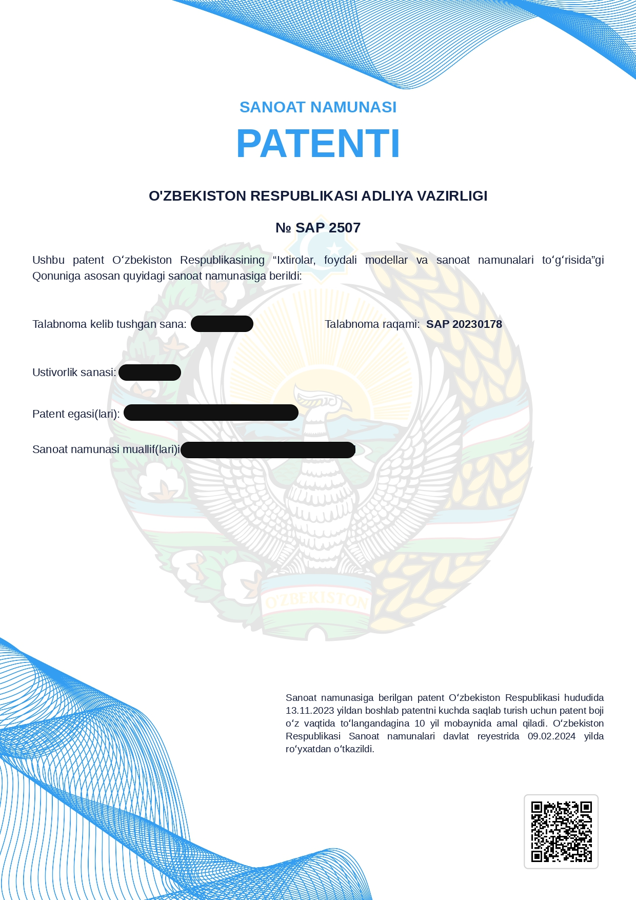 - Patent guvohnomasi 5 yilga beriladi va uni 3 yilgacha uzaytirish mumkin.