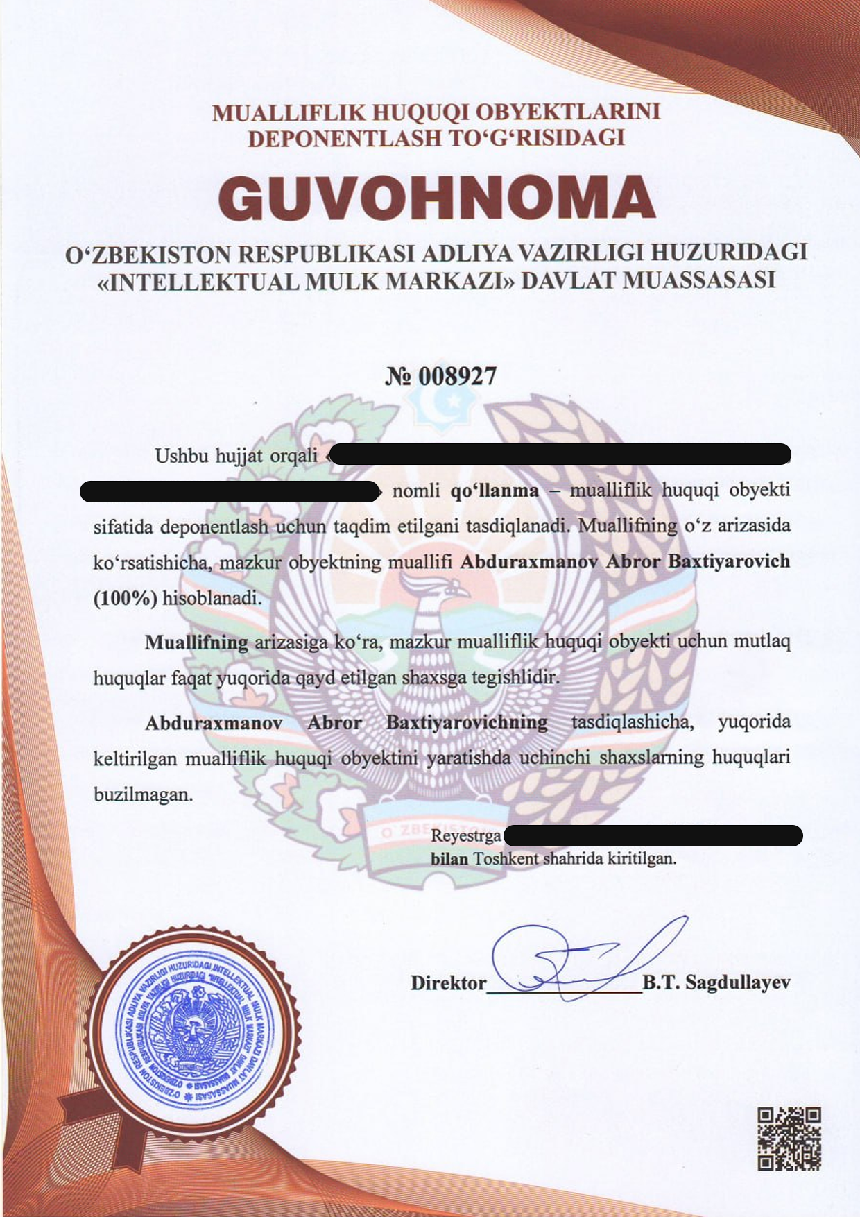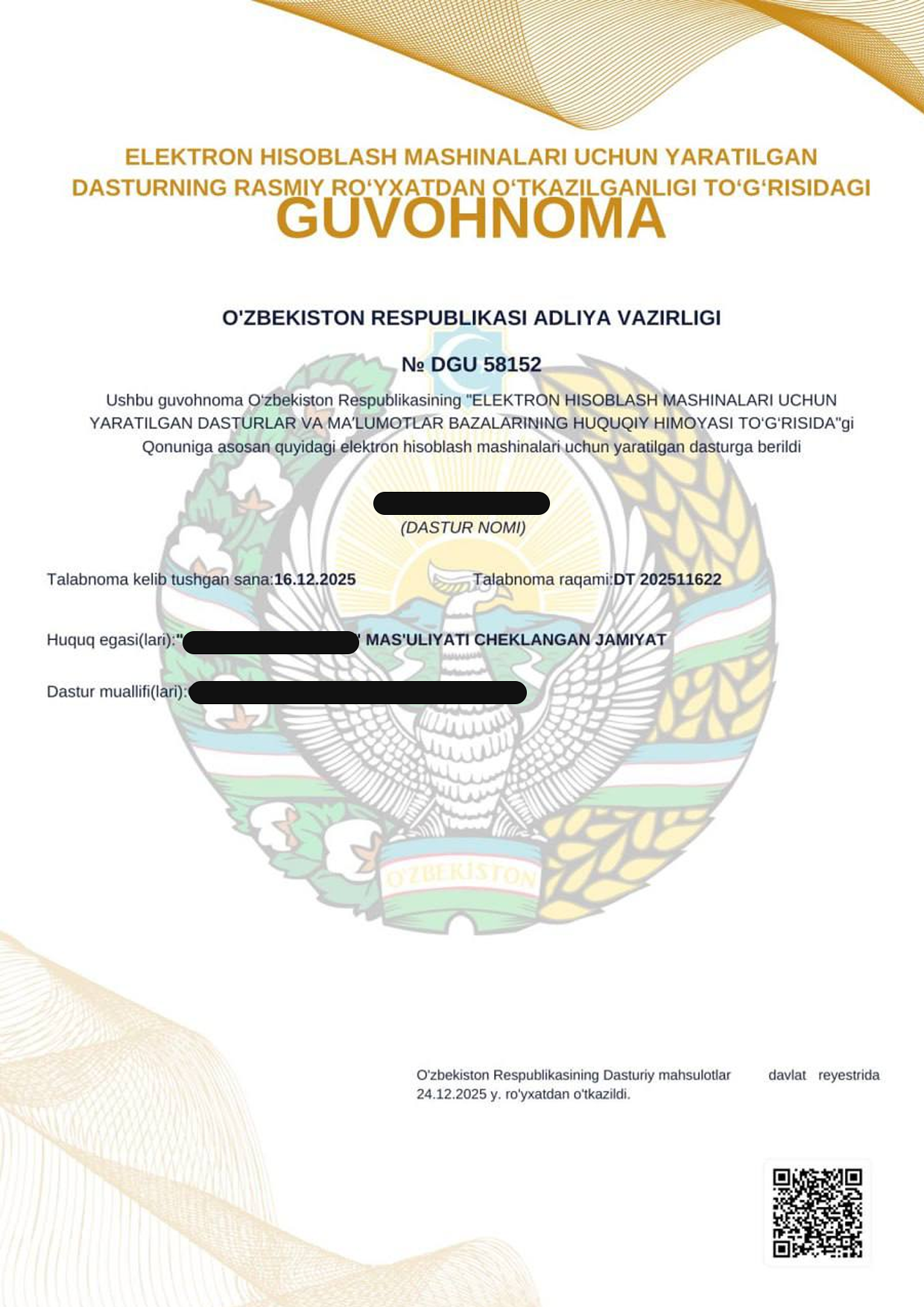 DGU: O’zbekiston Adliya vazirligi qoshidagi Intelektual mulk markazi tomonidan beriladigan mualliflik huquqi guvohnomasi, bu elektron hisoblash mashinalari uchun yozilgan dasturlarga, masalan, mobil ilova, web sayt, dasturiy ta’minot, ma’lumotlar bazasiga bo’lgan mualliflik huquqini tasdiqlovchi hujjat sifatida beriladi.
